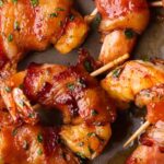 - Wrap each shrimp with a half slice of precooked bacon. Secure with a toothpick or small skewer to hold shape.
